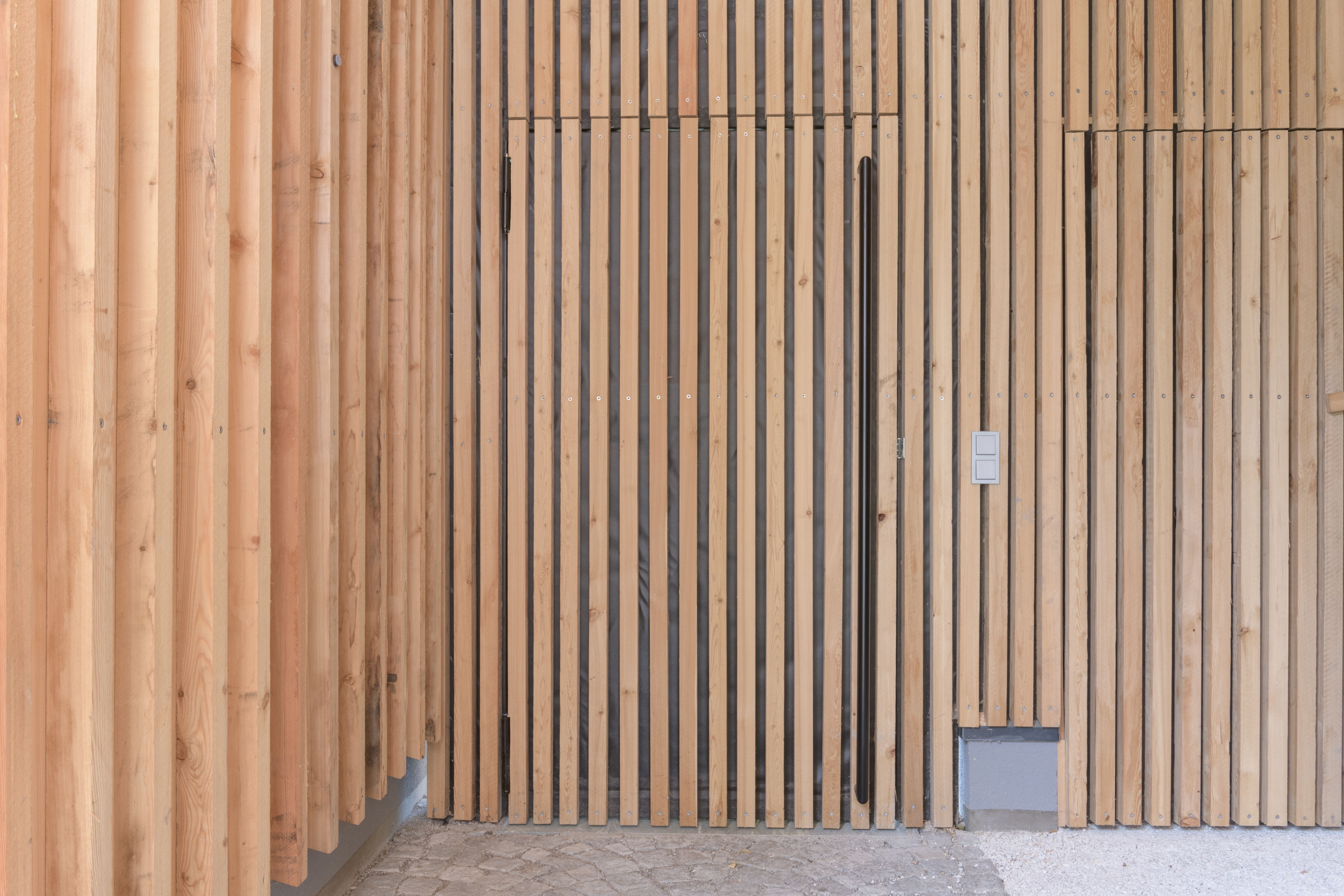 Die Haupthaustüre wurde außen mit einer astigen Lärche passend zur Fassade gefertigt. Auf der Innenseite haben wir die Haustüre in Tanne astarm, an die Innentüren angepasst. Die Haustüre wurde auf der Innenseite mit der Holzwand bündig gesetzt. Für ein Nebengebäude, wo der Kunde unter anderem eine kleine Werkstatt eingerichtet hat, haben wir die Nebeneingangstüren ebenfalls passend dazu in Lärche gefertigt.
