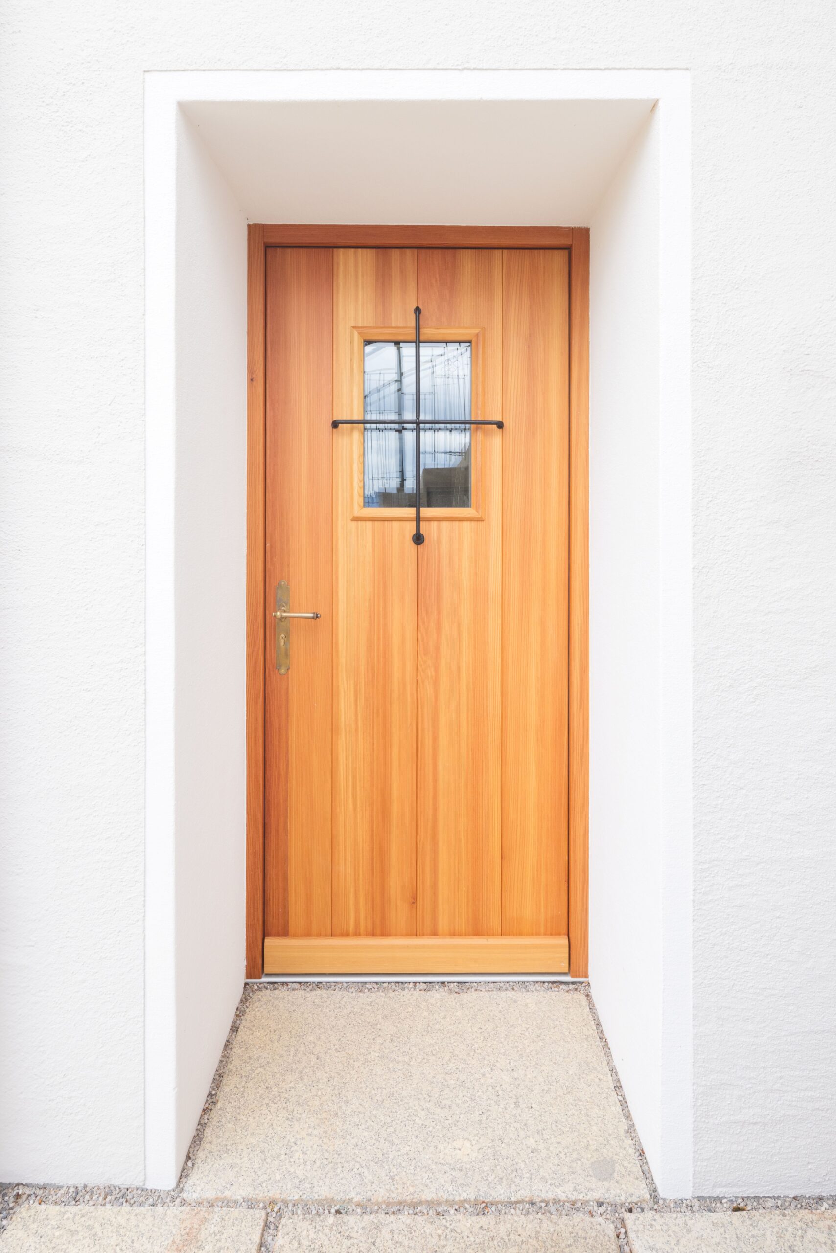 So auch bei diesen beiden Haustüren: Es handelt sich um einfache, aber hochwertige Türen aus astlosem, quer geschnittenem Lärchenholz mit V-Fugen. Die Fugen verleihen den Türen den nötigen Charakter und passen perfekt zu einem Salzkammergut Haus mit zweiflügeligen Sprossenfenstern. Im oberen Bereich des Hauses findet sich zudem eine Lärchenschalung mit Stulpleiste, die ebenfalls eine gewisse Teilung aufweist und so das Design harmonisch ergänzt.