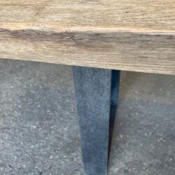 Altes Holz hat oft viel zu erzählen. Für einen Kunden durften wir aus einer alten Eichenblockwand, die noch mit geschnitzten Zahlen und Buchstaben angezeichnet wurde, einen Massivholztisch fertigen. Bei solchen Pfosten ist wichtig, diese so natürlich und unverändert wie möglich zu verarbeiten. Die Löcher von den Holznägeln, wo die Blöcke miteinander verbunden waren, haben wir gelassen. Sie sind auf der Tischkante zu sehen und unterstreichen den Charakter. Durch das Bürsten der Pfosten kommt das Holz noch mehr zur Geltung. Die Äste, Ecken, Löcher und Unregelmäßigkeiten haben wir nachgeschliffen, damit man sich weder einen Schiefer einziehen kann, noch beim Abwischen mit dem Tuch hängen bleibt. Die unregelmäßigen Übergänge von einem zum anderen Brett haben wir bewusst erhalten. Wie bei unseren Massivholztischen üblich, sorgen die eingebohrten Stahlwellen auf der Unterseite für die nötige Stabilität bzw. können die Pfosten nachgespannt werden. Der Haupttisch sollte etwas kleiner sein, daher haben wir aus dem Längenabschnitt einen kleinen Beistelltisch gefertigt. Dieser kann bei Bedarf als Tischverlängerung genutzt werden. Die Oberfläche haben wir roh gelassen. Das Tischgestell wurde aus Rohstahl gefertigt und eingeölt. Beim Gestell bzw. bei den Schraublöchern achten wir immer darauf, dass den Pfosten durch ein Langloch im Gestell Platz gelassen wird und die Platte Raum zum Arbeiten hat.