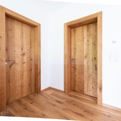Bein diesem Projekt durften wir für eine junge Familie Innentüren aus Eiche fertigen, wobei besonders „lebendige“ Türen gewünscht wurden. Daher haben wir bei der Produktion der Türblätter und der Schichtplatten – wir fertigen diese sozusagen „direkt vom Baum weg“ – eine besonders lebhafte Eiche gewählt. Im Gegensatz zu zahlreichen Mitanbietern, welche meistens nur furnierte Türen produzieren, verwenden wir dicke Vollholz-Deckschichten. Dadurch sind auch Türen mit großen Ästen, Kern oder mit wilden Maserungen bei uns kein Problem, während furnierte Türen nur ein unnatürliches Astbild liefern.