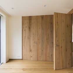 Neben den Türen durften wir für diesen Kunden auch eine Schallschutzdecke aus Eichenstäben, putzbündige Sockelleisten und die Kabinenverkleidung im Lift ausführen.