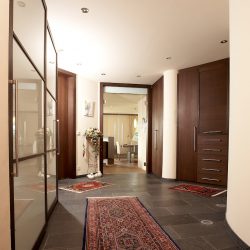 Um den Eingangsbereich trotz dunklem Holz offener und heller wirken zu lassen, wurden die Kastentüren mit schlanken Rahmen und satinieren Glasscheiben ausgeführt, zwischen Eingangsbereich und Essbereich wurde eine, auf den ersten Blick kaum erkennbare, Ganzglastüre verbaut.