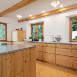 In vielen Fällen plant das Haus mit, so wie diesem Projekt, bei welchem wir die Innentüren gestalten und einbauen durften. Da der Neubau bereits mit zweiflügeligen Fenstern ausgestattet war, schlugen wir dem Bauherrn vor, dieses Gestaltungselement auch in den Innentüren aus Fichte fortzusetzen. Als der Vertrag für die Innentüren bei uns in Nussdorf am Attersee finalisiert wurde, zeigten wir den Gästen auch eine Küche, die zu dieser Zeit gerade im Entstehen war. Und so kam eins zum anderen: Auch die Planung der Küche wurde uns anvertraut. Da die Küchenelemente verschiedene Breiten und Höhen aufweisen, haben wir unseren Kunden glatte Fronten aus gedämpfter und gebürsteter Fichte vorgeschlagen, um den Raum optisch nicht zu überladen. Obwohl sehr schlicht gehalten, unterstreicht die Holzmaserung den rustikalen Charakter des Hauses auf zurückhaltende Art und Weise.
