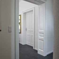 Bei diesem Projekt handelt es sich um ein denkmalgeschütztes Haus im Weinviertel. Perfekt zu den vorhandenen zweiflügeligen Kastenfenstern passen hier unsere Innentüren Modell Attersee und Model Weissenbach. Sowohl Fenster als auch Türen erstrahlen in edlem Weiß, wobei der hochwertige Lack per Hand mit dem Pinsel aufgetragen wurde: eine zwar aufwendige, aber perfekt zu diesem alten Gebäude passende Technik! Handwerkstechnik nach Maß kam auch aufgrund der verschiedenen Türgrößen zum Einsatz: da im Erdgeschoss die Türen etwas höher waren als im Obergeschoß, wurden hier die Türen mittig mit einer quer verlaufenden Füllung „verlängert“. Da die Türen im Obergeschoß mit einer Höhe von 200 cm über Standardmaß verfügen, wurde hier bewusst auf eine Querfüllung verzichtet, um kein gedrungenes Endbild zu generieren. Um große, glatte Flächen zu vermeiden, erhielten auch die Türstöcke in den dicken Wänden eine Füllung. Eine Besonderheit, die früher schon aus rein technischen Gründen nicht realisiert werden konnte. Bei der Kantenausführung fiel die Wahl auf eine Profilausführung, und zwar aus zweierlei Gründen: zum einen haben die Türen den nötigen Platz, um wirken zu können, zum anderen wurde diese Machart auch in früheren Zeiten in derartigen Häusern angewendet.