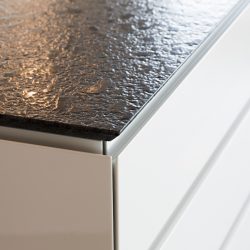 Um die großen weißen Flächen jedoch etwas aufzulockern, hatte der Kunde den Wunsch, die Fläche hinter den Arbeitsflächen in kräftigen Farben erstrahlen zu lassen. Daher haben wir Glasscheiben in den gewünschten Farben lackiert und angebracht.