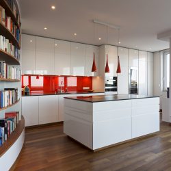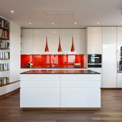Um die großen weißen Flächen jedoch etwas aufzulockern, hatte der Kunde den Wunsch, die Fläche hinter den Arbeitsflächen in kräftigen Farben erstrahlen zu lassen. Daher haben wir Glasscheiben in den gewünschten Farben lackiert und angebracht.