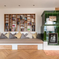 Neben der Optik stand auch echte Handwerkskunst im Vordergrund: Beim handgezinkten Bett, bei den Küchenfronten auf Gehrung oder bei der fortlaufenden Maserung bei den Laden und Türen – an vielen Ecken des Hauses wird echtes Handwerk deutlich. Entspannung und Gemütlichkeit garantiert in diesem Haus vor allem die Liegebank neben dem Kachelofen. Wer ein Polster oder eine Decke benötigt, der findet diese in den Laden unter der Bank. Und das sich dahinter befindende Bücherregal wurde in der Wand bündig versenkt.