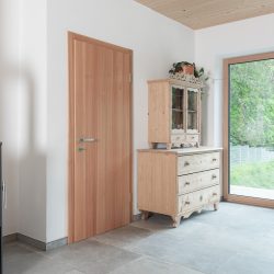 Bei diesem Projekt durften wir das Haus des Kunden mit schlichten Lärchentüren ausstatten. Als der Kontakt zu uns entstand, waren die Grundkomponenten – Eichenboden, grauer Fliesenboden, Lärchenfenster sowie Fichtendecke – schon vorhanden. Der Kunde wünschte sich ursprünglich Eichentüren. Wir konnten ihn allerdings rasch von diesem Vorhaben abbringen und für Lärchentüren begeistern. Wie auf dem Titelbild zu sehen, haben wir die Tür in der gleichen Machart wie die Fenster gefertigt. Ganz nach dem Motto „Gleich und gleich gesellt sich gern“ sollten verwandte Bauteile in derselben Ebene stets einheitlich wirken. Auch eine weitere, seit Jahrhunderten angewandte Regel, kam bei diesem Projekt zum Einsatz: Diese besagt, das Holz in einem Raum von unten nach oben heller und/oder weicher werden zu lassen. Durch die ruhige und zeitlose Abstimmung wirken die Räume trotz Dekoration und alter Bauernmöbel auch überlagen.