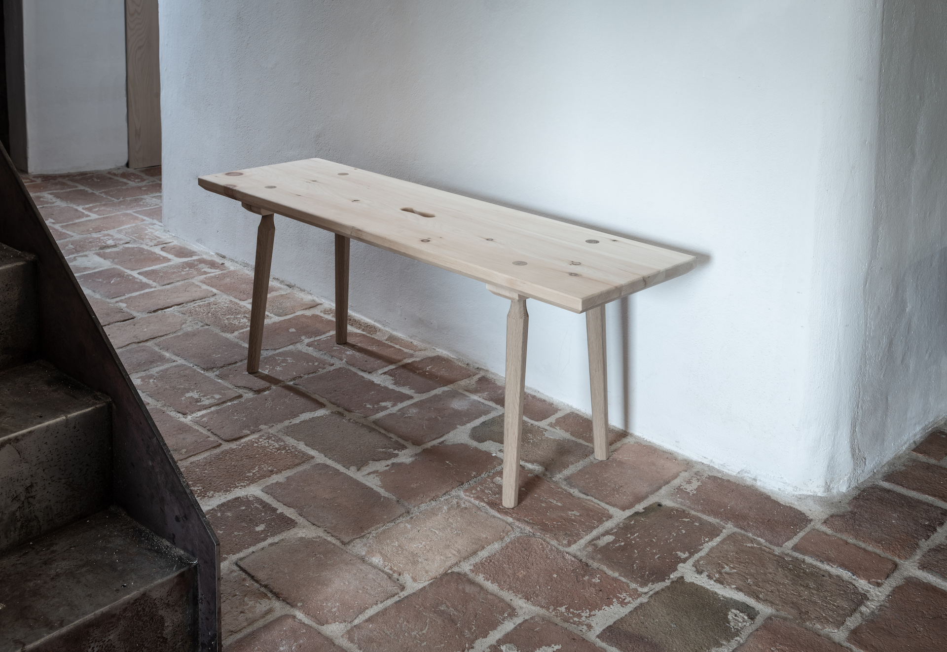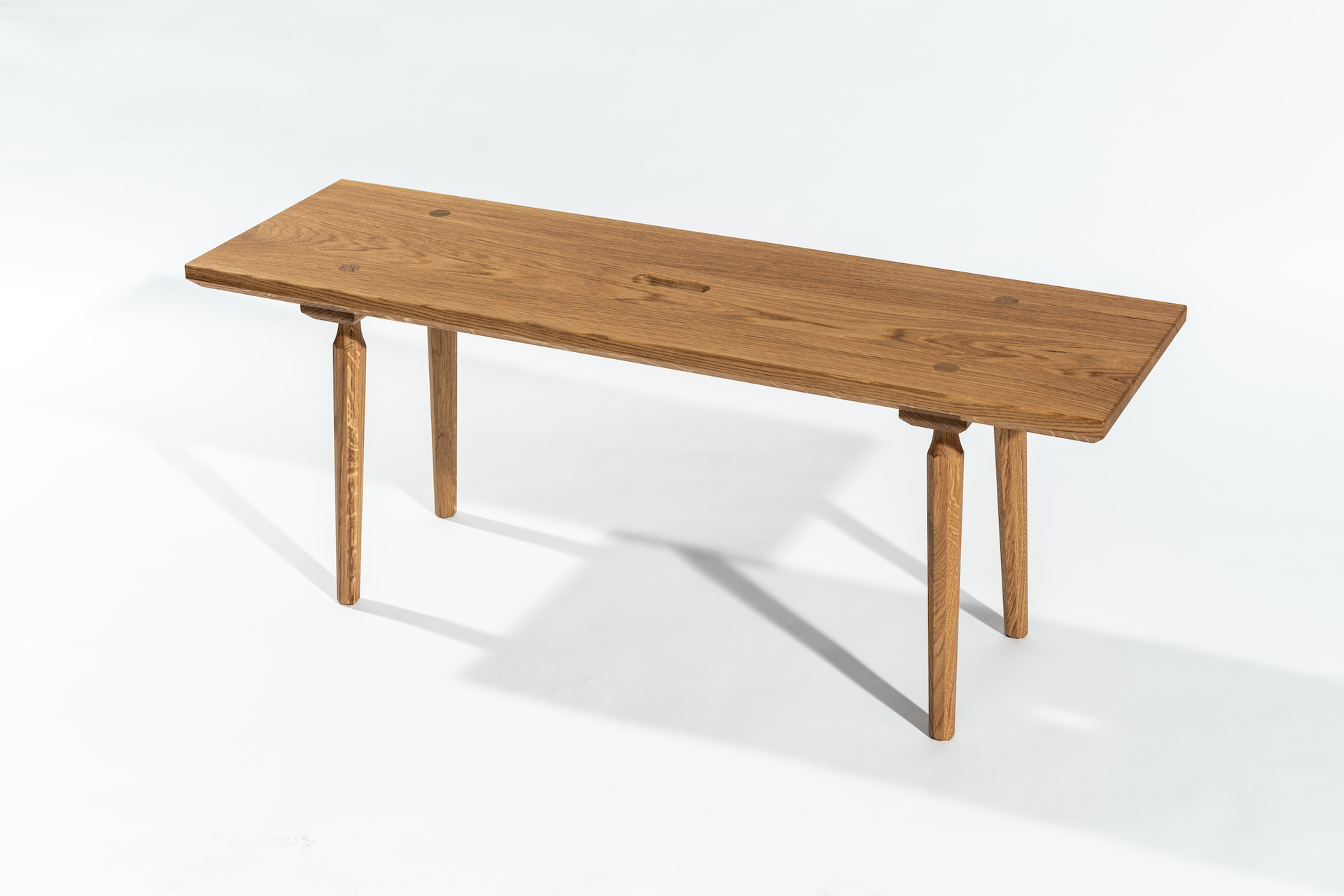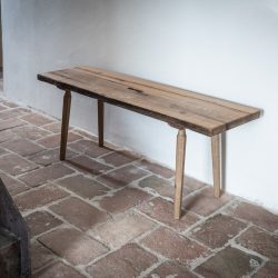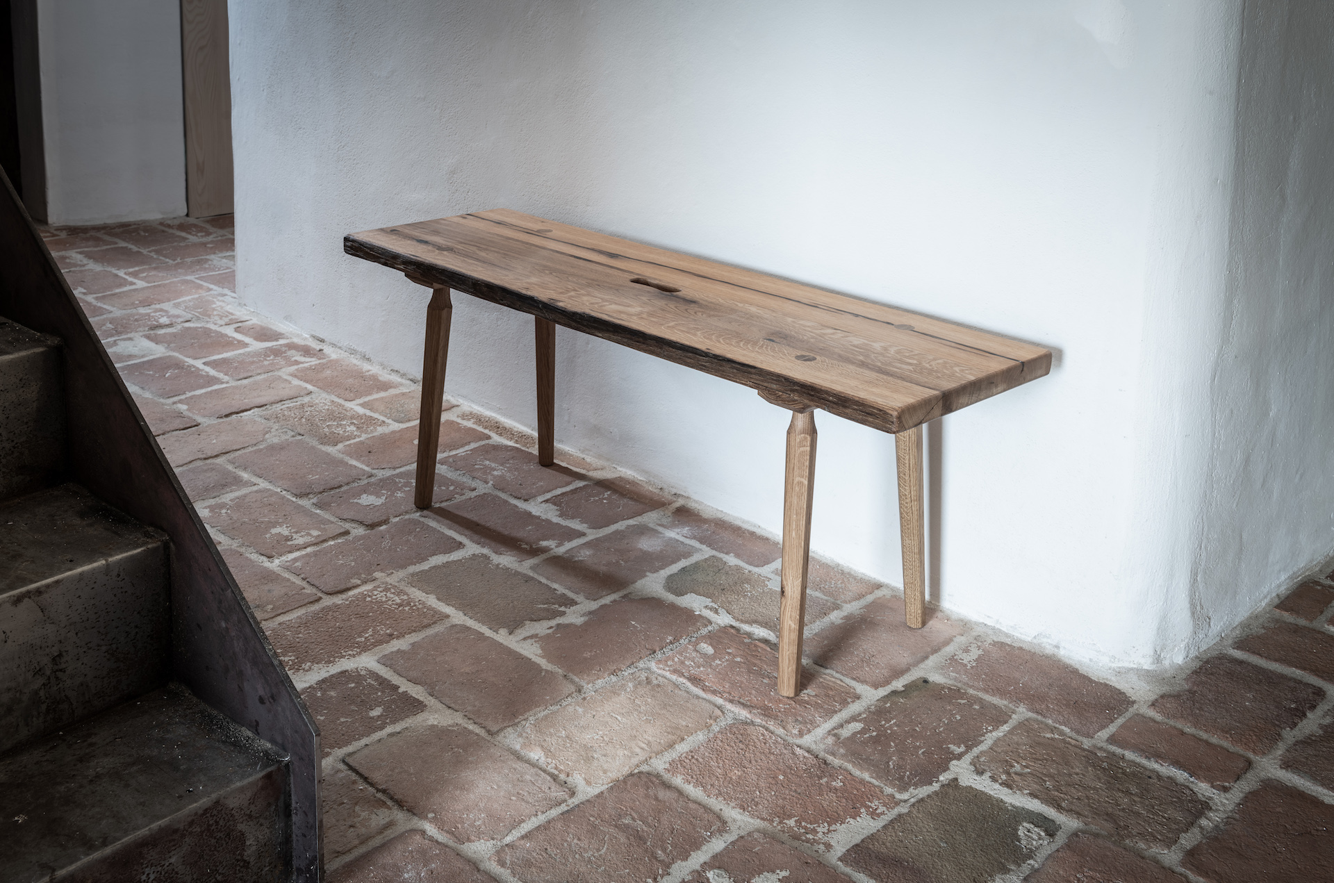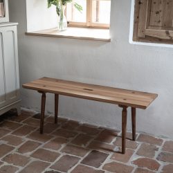 Die „Vierbank“ war früher in jedem Haus zu finden. So nennt man diese Art von Bänken bei uns in der Gegend. Die Bank stand gerne vor dem „Jogltisch“, beim Kachelofen, in der Küche oder vor der Haustüre. Diese Bänke zeichnen sich durch ihre einfache handwerkliche Machart mit echten Verbindungen aus. Das Sitzbrett wird mit Gratleisten, die unten eingearbeitet werden, gerade gehalten. Die achteckigen Füße, die sich Richtung Boden verjüngen, werden in die Gratleiste und in das Sitzbrett sichtbar eingezapft. Der Zapfen wiederum von oben mit einem eingeschlagenen Keil gesichert. Genau so hat das auch schon mein Opa und Uropa gemacht. In der Mitte der Bank befindet sich ein Griff, mit dem man die Bank ganz leicht umstellen kann. Somit optimal für ein schnelles und gemütliches „zomsitzen“ auf ein Bier oder Schnapserl geeignet.