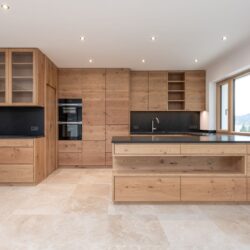 Das Hauptholz in diesem Haus, ist ganz klar die Eiche. Diese Holzart kam bei den Fenstern, Böden, Auftrittsstufen, Innentüren und bei der Küche zum Einsatz. Die Innentüren und die Küche haben wir in unserer gewohnten Massivholzausführung, mit fortlaufender Maserung, gefertigt. Wie bereits erwähnt, haben wir auch die Küche aus Eiche gemacht. Die Oberfläche lackieren wir bei Küchen gerne, weil diese somit leichter zu reinigen sind. Auch bilden sich nicht so leicht „Griffspuren“ an den Stellen, wo man häufiger hin greift. Die Oberfläche bei den Innentüren wiederum, wurde bisher eher geölt. Die Tendenz geht aber auch hier Richtung Lack. Das liegt vermutlich daran, dass es heute eine Vielfalt an Lackoberflächen gibt und auch solche, die matt sind und eine natürliche Haptik erzeugen. Wenn man bei Türen mit einer geölten Oberfläche beim nassen Wischen nicht aufpasst, bekommen diese gerne einen grauen Rand. Das ist bei lackierten Türen deutlich besser. Wie bei vielen Projekten, wurde daher im Erdgeschoss ein Fliesenboden verlegt und die Oberfläche bei den Türen mit einem matten Lack versehen.