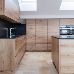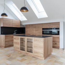 Bei der aktuellen Wohnung wurden wir mit der Fertigung der Innentüren und der Küche beauftragt. Nachdem die Fenster weiß und somit neutral sind, hatte man bei der Holzwahl für die Massivholztüren mehr Spielraum. Die Entscheidung fiel auf eine astarme Lärche, welche hervorragend mit dem zeitlosen Sollnhofner Steinboden harmonisiert. Der warme, leicht rötliche Farbton der Lärche spiegelt sich im Boden wieder. Dazu passt ebenfalls die – in diesem Fall eher lebendigere – Ulme, welche bei der Küche zum Einsatz gekommen ist. Im Gesamtbild wirken alle verwendeten Materialen sehr stimmig und harmonisieren gut miteinander. Aufgabe bei der Küchenplanung: Der Platz sollte, trotz der darin vorkommenden Dachschrägen, bestmöglich genutzt werden. Unser Möbelplaner Manfred Hofer ist hier Spezialist und durch seine langjährige Erfahrung profitieren unsere Kunden immer wieder. Wichtig ist uns dabei immer, dass die Maserung vom Ladenvorderstück bis zum Nächsten weiter läuft und die Fugenteilung in den Fronten harmonisch werden. Ein gelungenes Projekt wie wir finden, wir wünschen unseren Kunden lange Freude mit unseren Arbeiten.