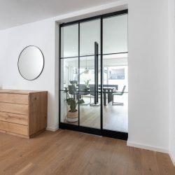 In diesem Haus durften wir bereits einige Dinge umsetzen und bedanken uns an dieser Stelle für das entgegen gebrachte Vertrauen (Ein Haus mit großer Verwandlung). Nachträglich durften wir jetzt noch die Kommode im Eingangsbereich machen und es sollte der Wohnbereich abgegrenzt werden. Dabei sollte jedoch nicht der „offene“ Charakter verloren gehen. Aus diesem Grund fiel die Entscheidung auf schlanke Metallrahmen mit Glaselementen. Dieser Look stammt von alten Industriefenstern, wo die Scheiben mit Fensterkitt eingekittet wurden. Diese Türenart ist sehr wandelbar bzw. hat ein sehr großes Einsatzgebiet. Sie passt sowohl in moderne Häuser kombiniert mit glatten Türen, in Häuser mit Altholz im ländlichen Bereich, als auch in Häuser kombiniert mit klassischen Rahmentüren. Bei der Gestaltung legen wir immer sehr viel Wert auf die Symmetrie. Soll mit dieser Art von Türe ein Akzent im Haus gesetzt werden, können wir die Scheiben auch in anderen Farben gestalten. Wir können auch ganze Wände oder Schiebetüren in dieser Optik machen. In diesem Fall wurde der kleine Teil der Türe fix gemacht und der Gehflügel mit einem Pivotbeschlag angeschlagen. Durch das Hereinsetzen der Lagerung, verleiht es dem Element nochmal eine sehr interessante Ansicht. Aber dieser Beschlag von Frits Jurgens ist nicht nur interessant, sondern hat auch eine Menge an Funktionen: er trägt ein Flügelgewicht von 500 kg, hat eine Arretierung bei + 90°, 0° und – 90° und dämpft das letzte Stück bevor er in der Mitte stehen bleibt. Das kann man ganz gut in dem Video erkennen, dass wir angefügt haben. Wenn Sie mehr über diese Beschläge erfahren möchten oder wo diese noch eingesetzt werden können, lohnt sich ein Blick auf die Homepage vom Hersteller. Wir haben die Beschläge schon mehrfach verbaut und können aus unserer Erfahrung nur Positives berichten.