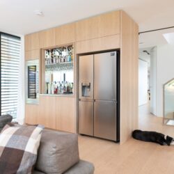 Für einen bestehenden Kunden durften wir zwei Räume gestalten, die neu angebaut wurden. Im Wohnzimmer sollte eine Minibar mit Wein- und Eiskühlschrank entstehen. Gerne verwenden wir in solchen Situationen die „Pocketauszüge“ der Firma Hawa . Damit kann man im Nu aus einer glatten, zusammengeräumten Front, ein bedienerfreundliches, offenes Möbel gestalten. Ebenfalls hat man mit diesen Beschlägen keine offenen Möbeltüren, die im geöffneten Zustand im Weg stehen. Die Minibar haben wir aus einer weißlich geölten Eiche gefertigt, damit das Element auch optisch zu dem weißlich geölten Boden passt.