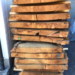 Unter anderem einen Birnbaum mit einer Breite von 1 m, Eschenscheiben mit 120 cm Durchmesser und Eichenaltholzpfosten aus alten Presssäulen. Auch alte Pressköpfe waren wieder dabei, die wir gerne als Tischgestell verwenden.